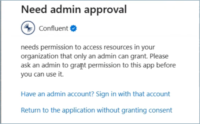 Trying to sign in to Confluent Cloud using Azure default SSO, you get an error with, Admin approval required. This can happen the first time you log in to Confluent Cloud after clickthrough or group mappings have been enabled.