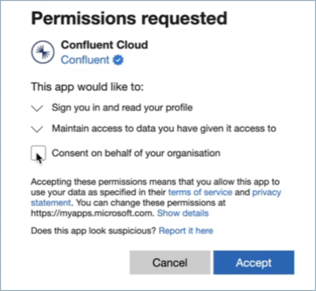 Before SSO users can sign in, an Azure Tenant Administrator must grant permissions to the Confluent app.
