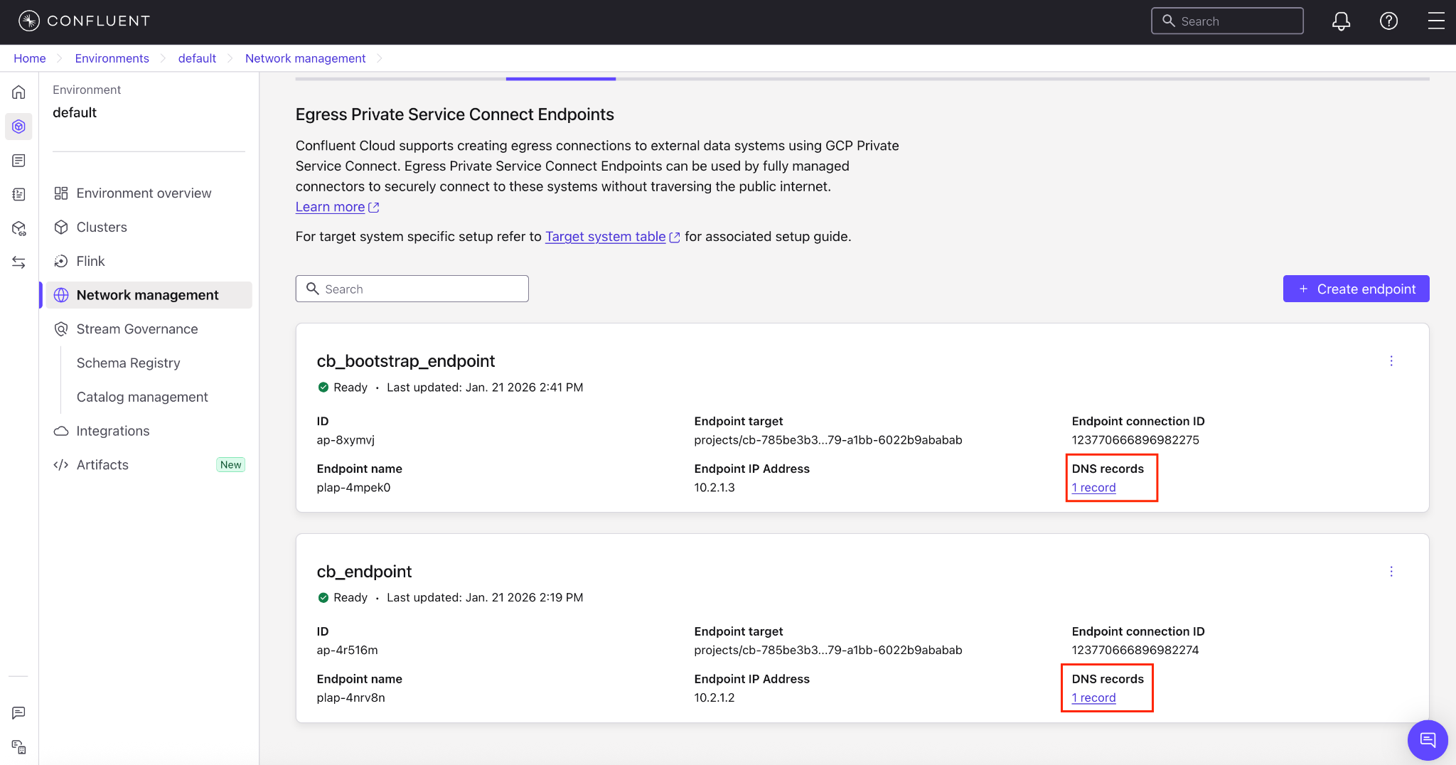 In the Network management page or tab of the desired Confluent Cloud environment, click the Confluent Cloud network you want to add the Private Service Connect endpoint to. The Connection Type of the network should be Private Service Connect.