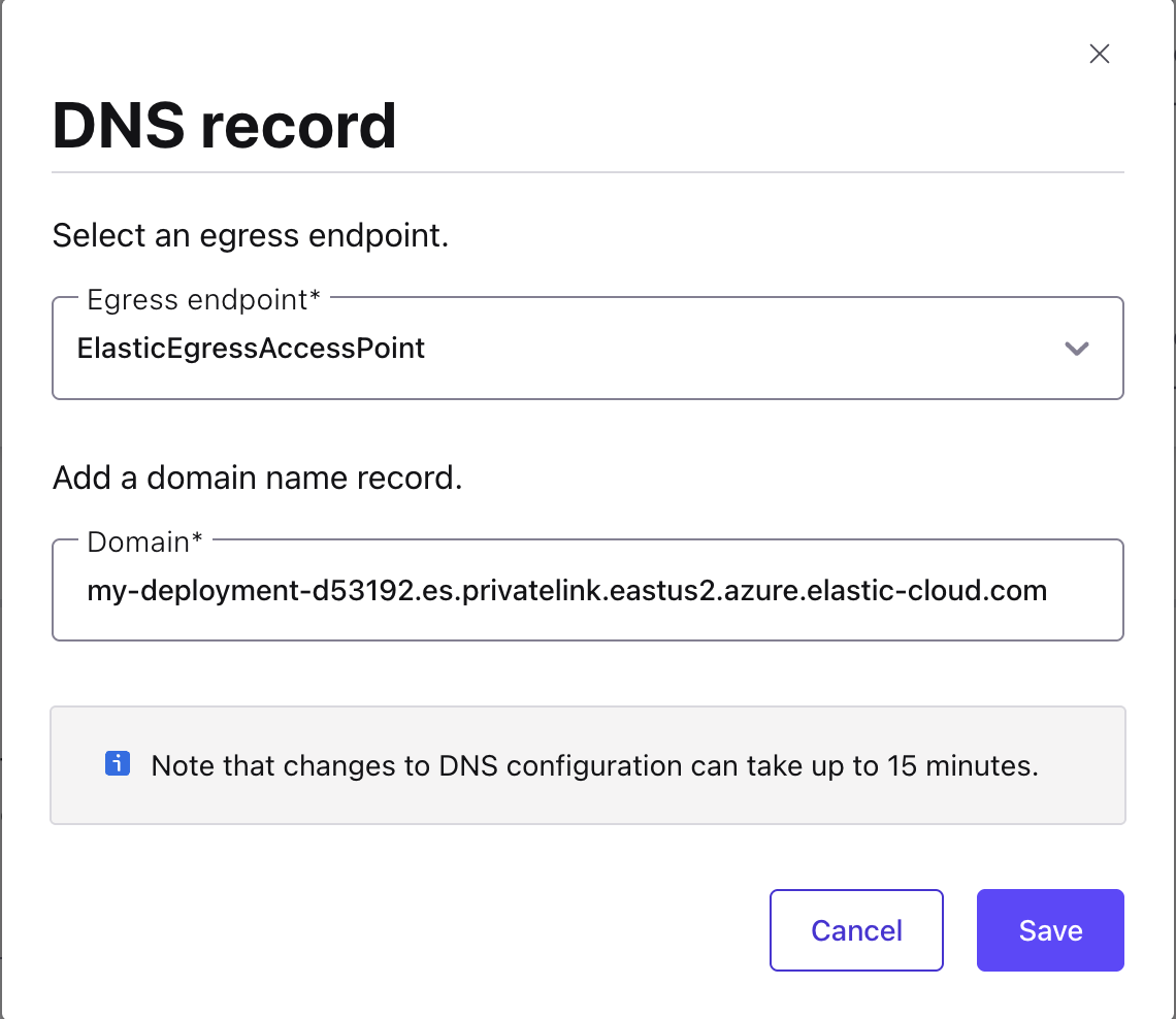 Domain: When creating the DNS record for Azure Private Link, the Domain value must exactly match the Elasticsearch endpoint you plan to use. Elasticsearch supports two valid endpoint formats, and the required DNS record depends on which one you choose.