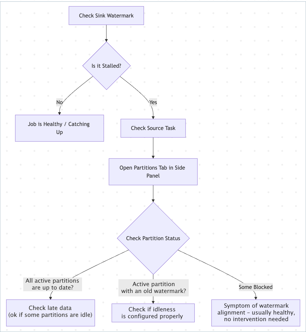 This holds true if all partitions are active and if some are idle/blocked. For stalled watermarks, always focus on active partitions with old watermarks.