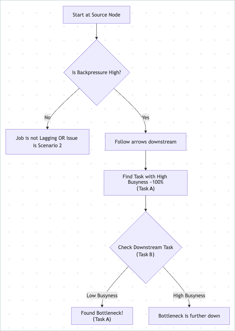 Start at the source node. If lag exists, the source usually shows high backpressure.