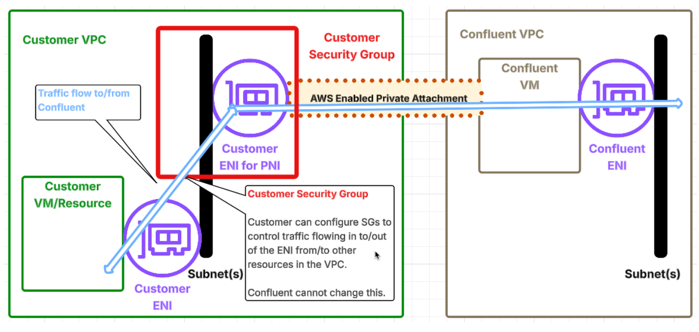 Confluent PNIs retain all properties and behaviors of AWS ENIs, including the security rules you defined through security groups.