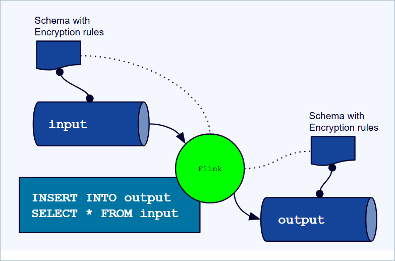 If Flink runs without key access, encrypted fields pass through as raw ciphertext. The output can contain encrypted bytes without the encryption metadata needed to decrypt them. This is true for ciphertext with no rules and no encryption in output, and for encrypted rule-less ciphertext with encryption in output. In both cases, unusable ciphertext is written to the output topic.