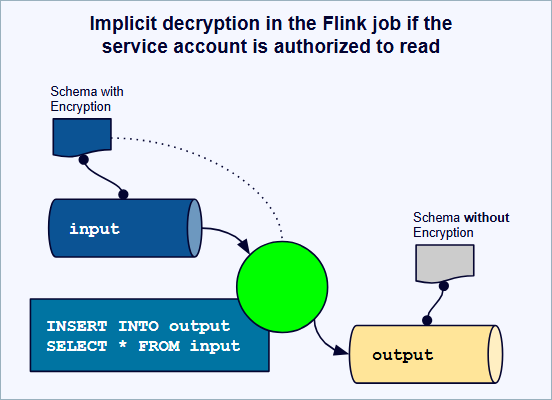 Flink automatically decrypts encrypted fields for processing when you have the required permissions. The decrypted data is available for all SQL operations. This mode requires that you share Key Encryption Keys with Confluent and grant permissions to access them.