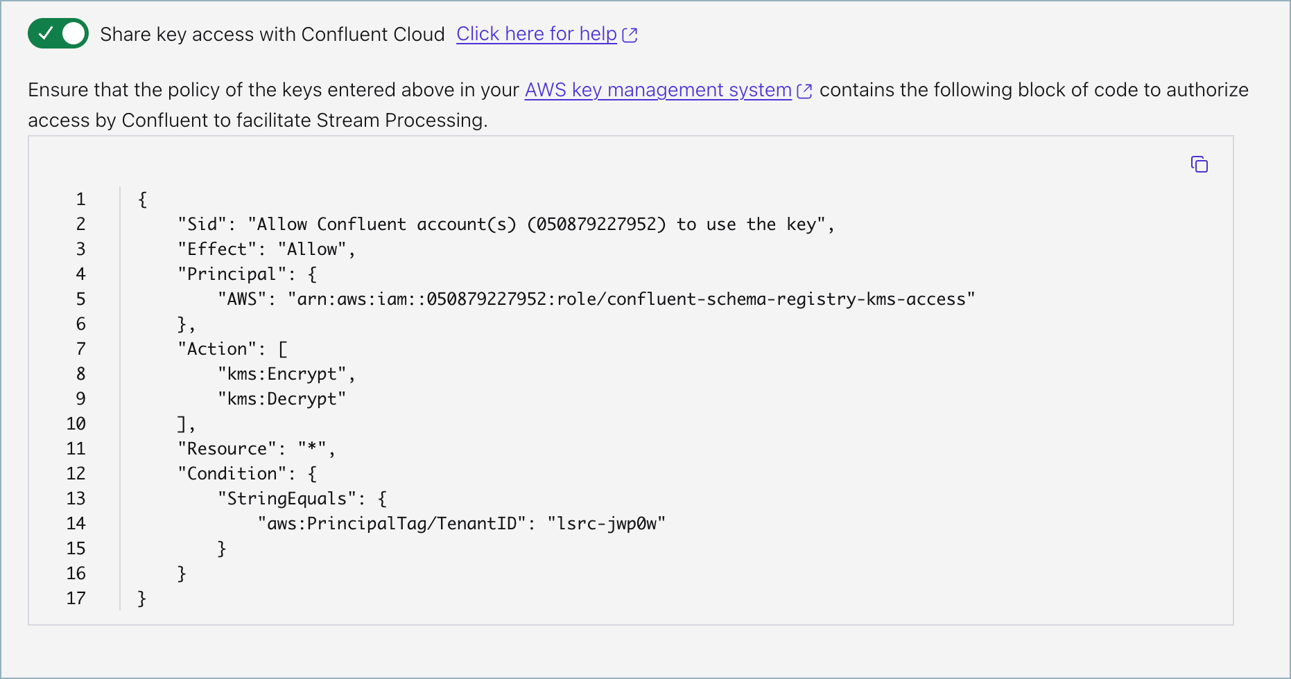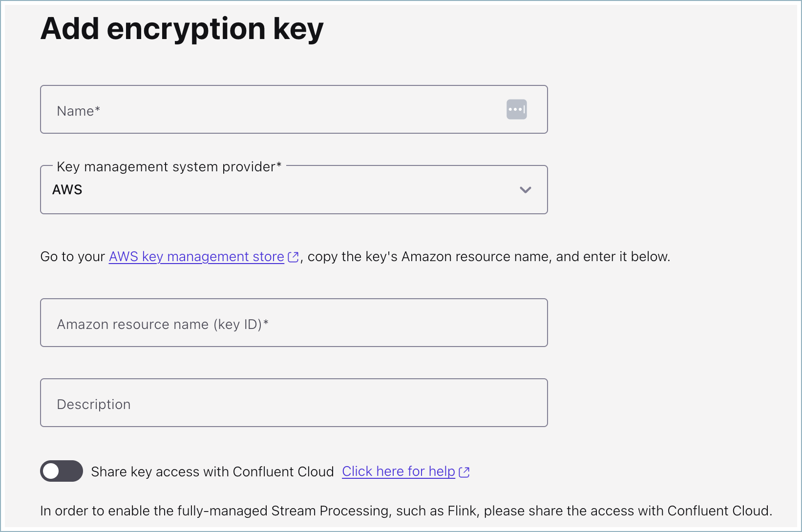 Optionally, enable Share key access with Confluent Cloud to allow Confluent to perform server-side operations that require temporary decryption within Confluent Cloud. If you enable this option, follow the steps below to create an encryption key for your key management service (AWS, Azure, or Google Cloud).