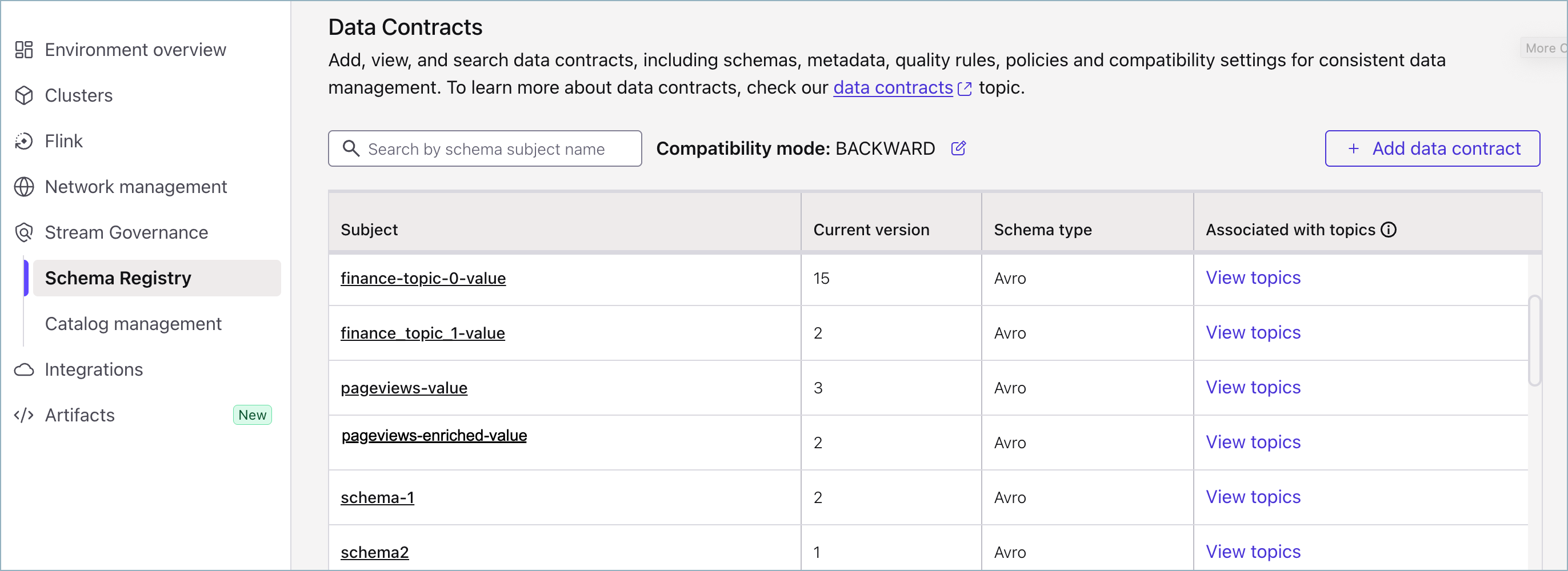 In the left navigation menu, click Stream Governance > Schema Registry > Data contracts.