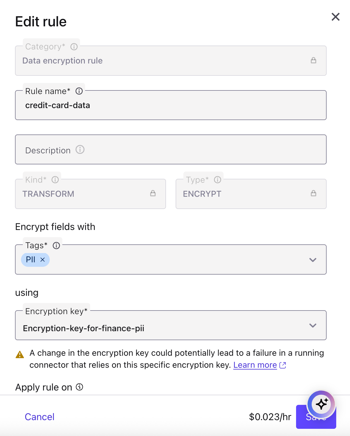 In the Encrypt fields with section, select the Tags that the rules apply to and select the Encryption key that you want to use.