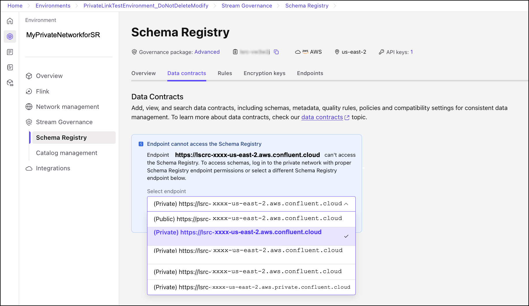 If you have a Confluent Cloud network configured for Dedicated Kafka clusters, this is a quick-and-easy starting point for setting up private networking on AWS or Azure. With a CCN already configured, and at least one Kafka Dedicated cluster in the environment and region, a corresponding private endpoint for the Schema Registry is automatically provided in the same region. You can view this on the Confluent Cloud Console at Environment > Schema Registry > Endpoints.
