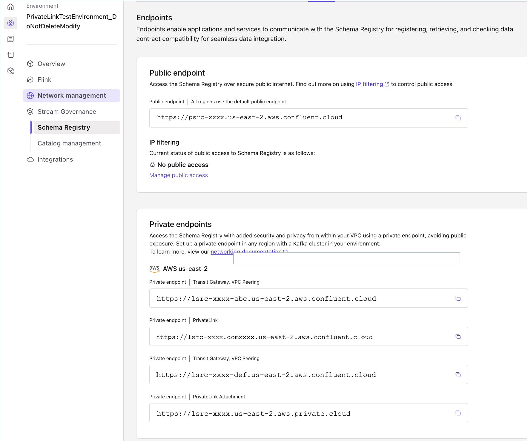 <service-identifier>.<nid>.region.cloud.confluent.cloud. Obtain the corresponding private endpoint by replacing the<service-identifier>with the LSRC ID. For example,lsrc-xxxx.<nid>.region.cloud.confluent.cloud.For VPC Peering and Transit Gateway, use the endpoint suffix for the network: