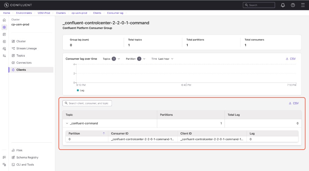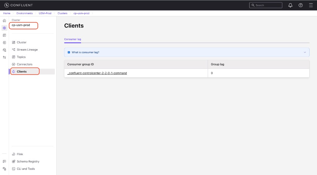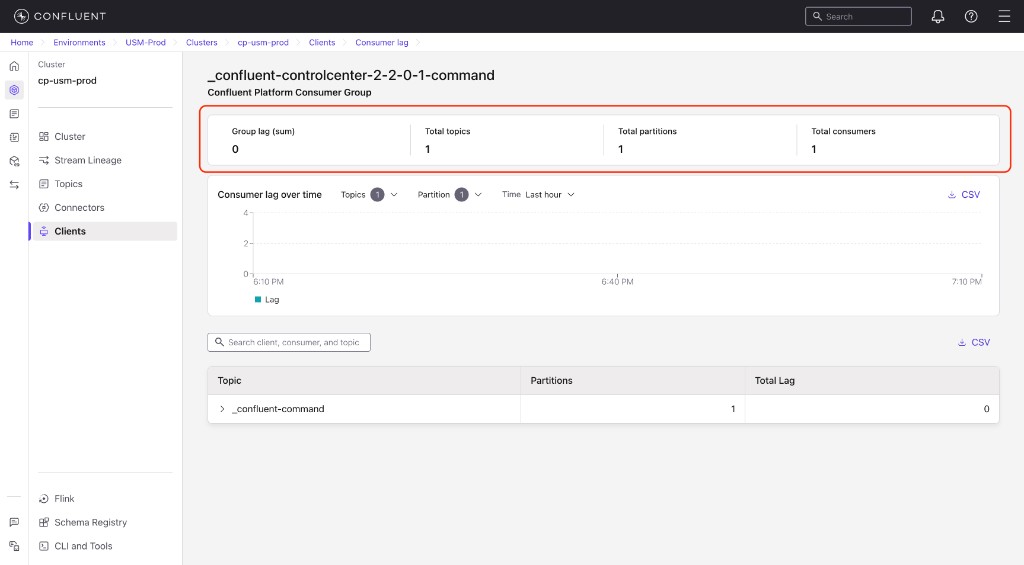 You can monitor Apache Kafka® consumer lag for your Confluent Platform clusters registered with Unified Stream Manager (USM) in the Confluent Cloud Console. Consumer lag is the number of consumer offsets between the latest message produced in a partition and the last message consumed by a consumer. A large or quickly growing consumer lag indicates that consumers can’t read from a partition as fast as messages are produced. Common causes include a slow consumer, slow network, or slow broker.