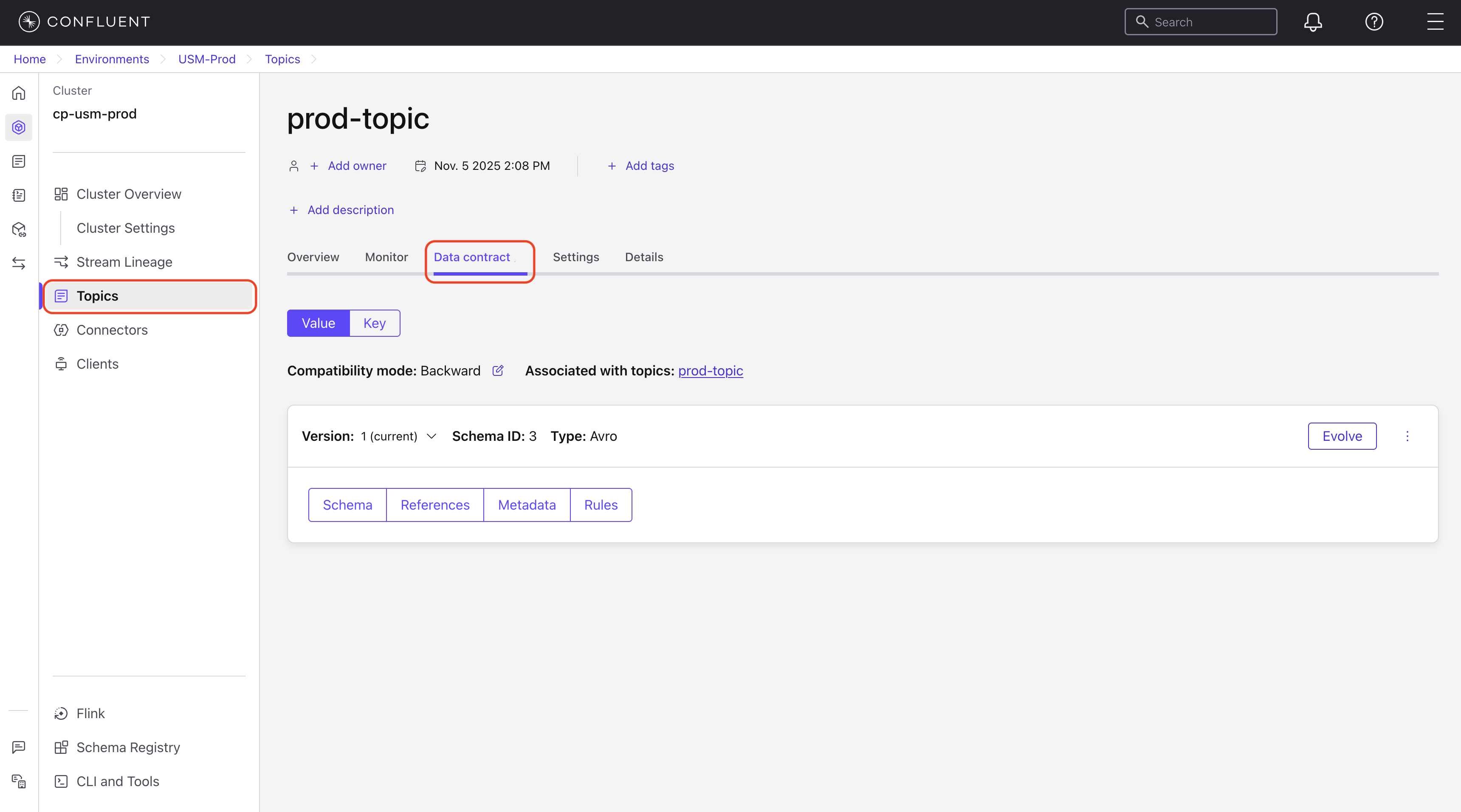 The Data Contract tab defines the schema and rules for the data published to this topic, which ensures data quality and compatibility. This tab displays the schema, references, metadata, and any rules applied to the data.