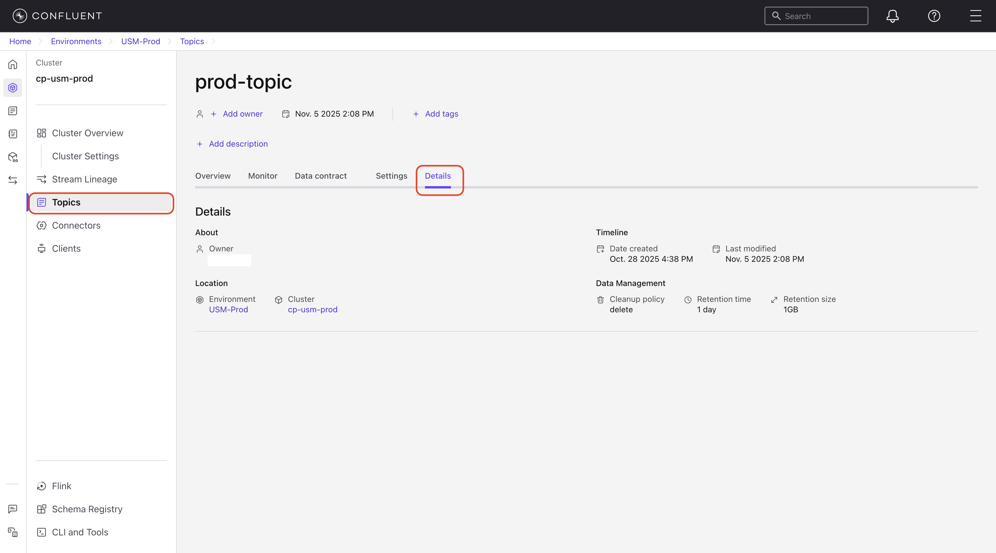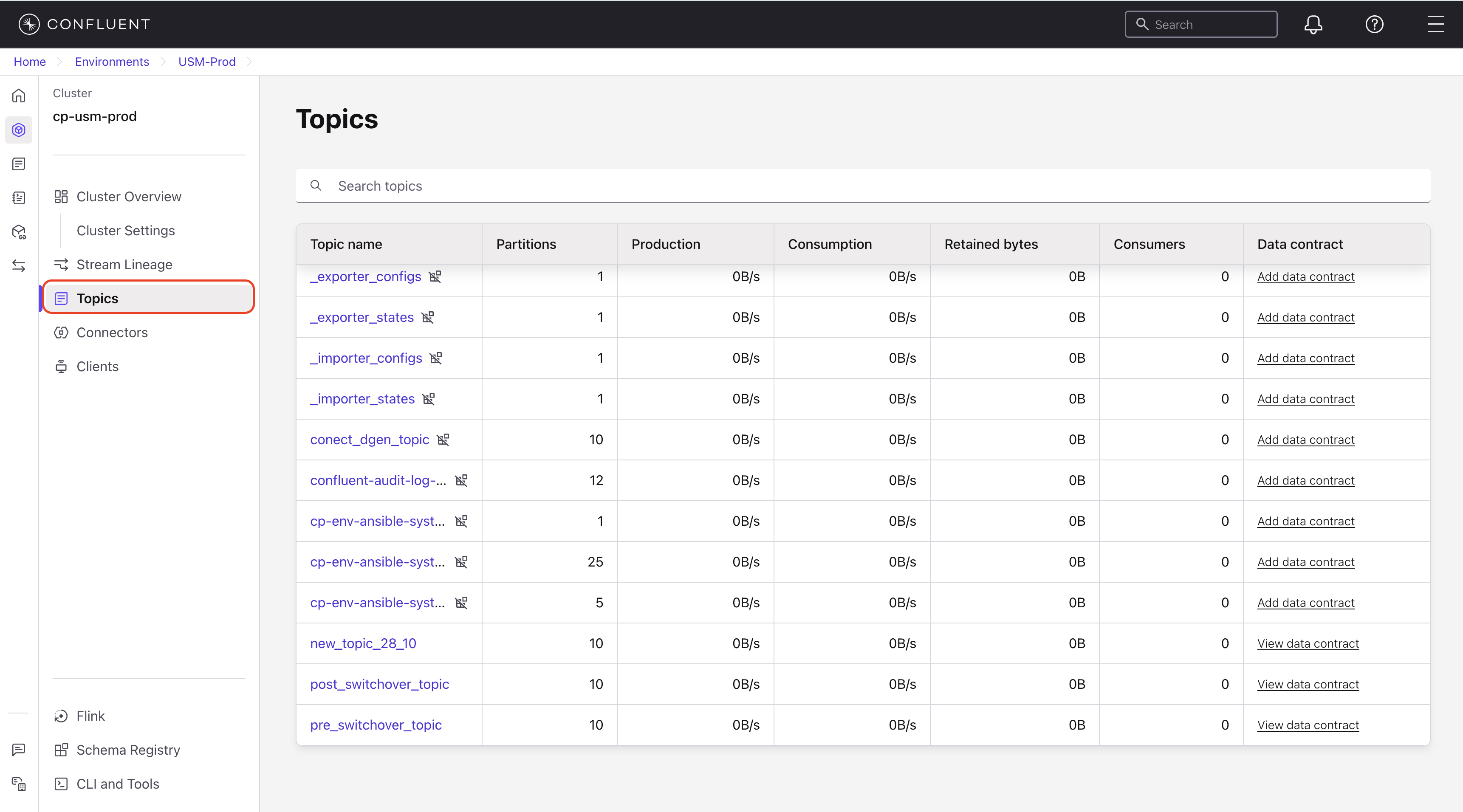 An Apache Kafka® topic is a category or feed that stores messages. Producers write data to topics, and consumers read data from topics. Topics are grouped by cluster in environments. This interface lets you monitor the activity and high-level details of all your topics at a glance.