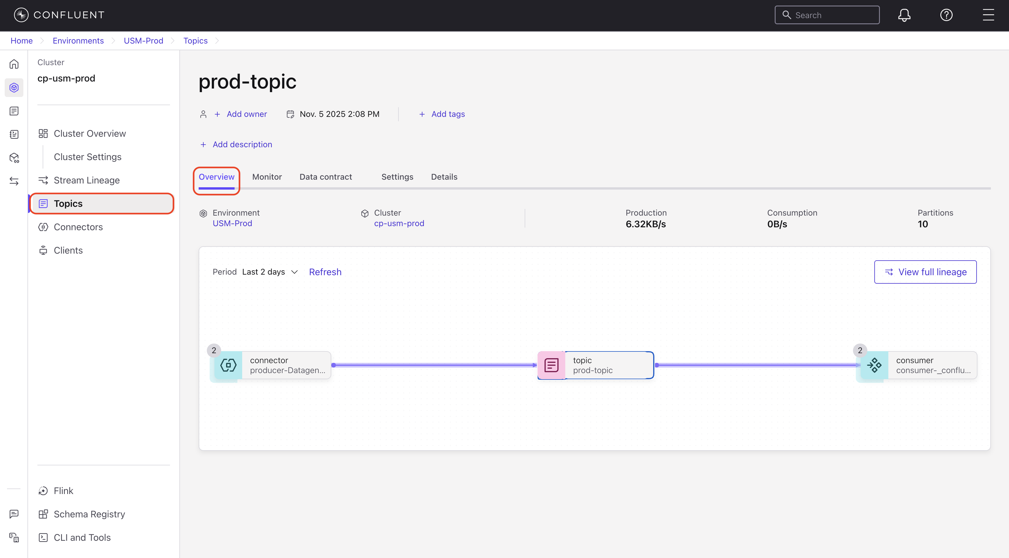 The Overview tab includes a Stream Lineage visualization that shows the data flow for the topic. Click View full lineage to open the complete lineage diagram. For more information, see Track Data with Stream Lineage on Confluent Cloud.