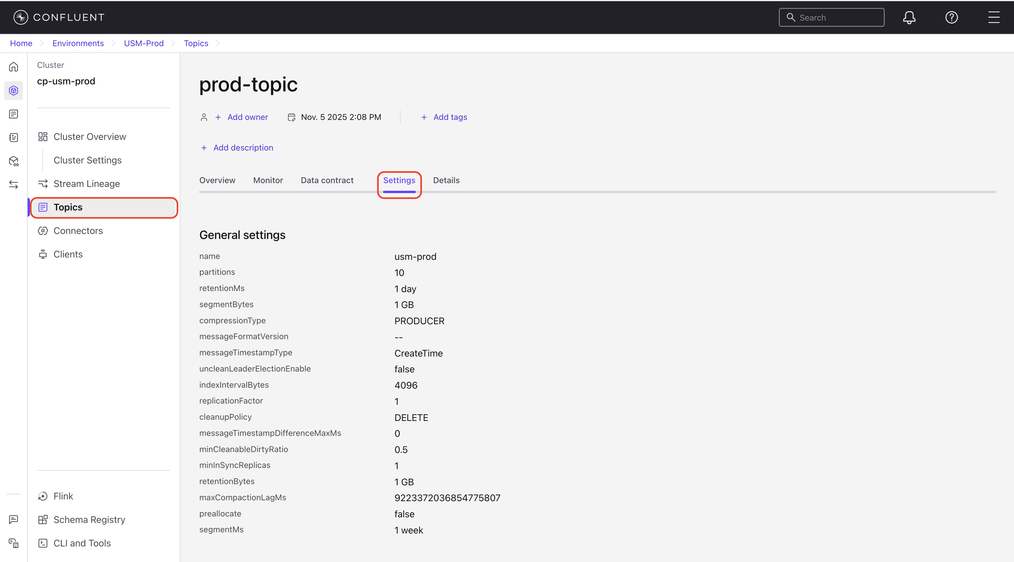 The Settings tab displays the topic’s configuration parameters. These settings are read-only in the Confluent Cloud Console and must be modified from your Confluent Platform environment.