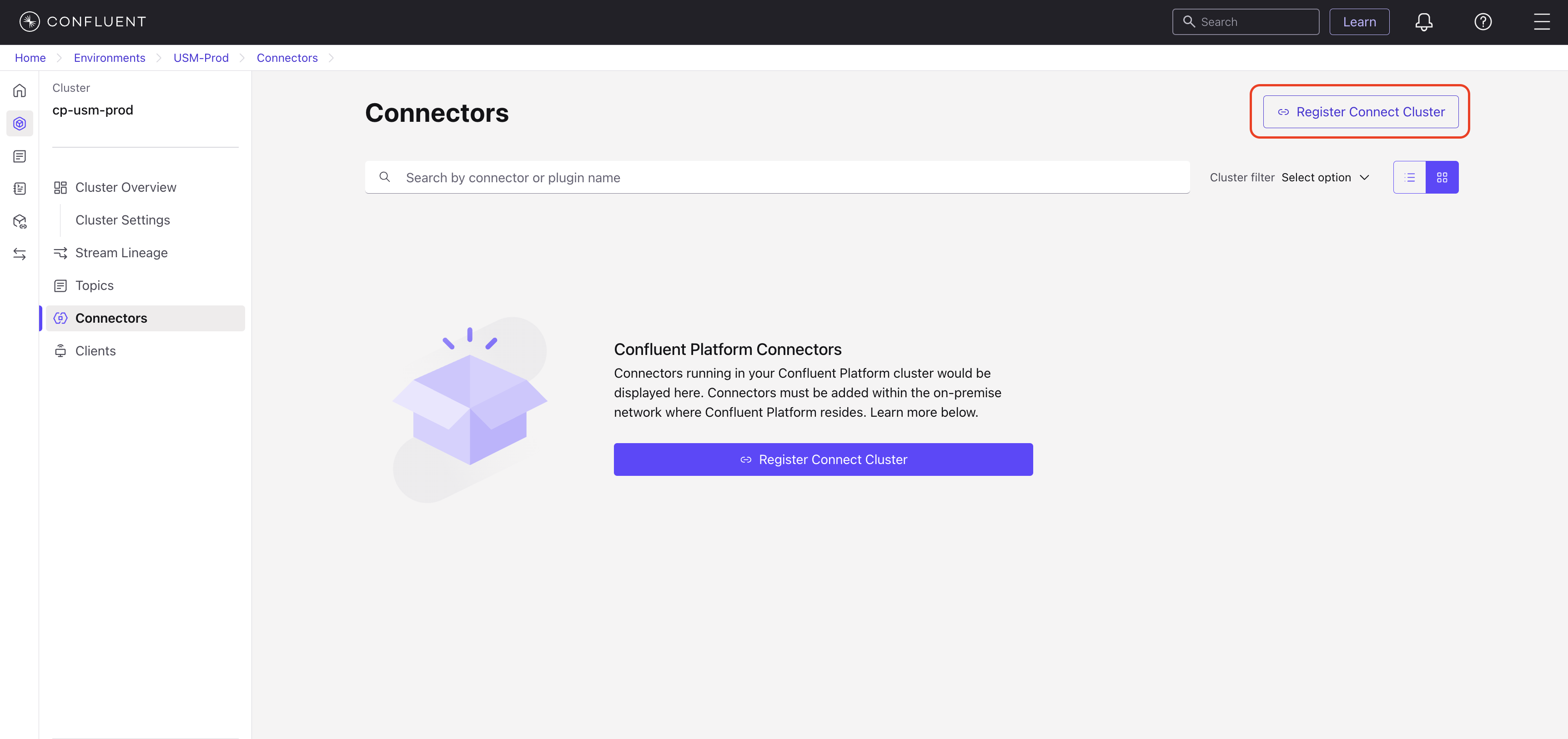 Alternatively, If connectors are already running but the cluster isn’t registered, a Register Connect cluster button is also available at the top right of the Connectors page.