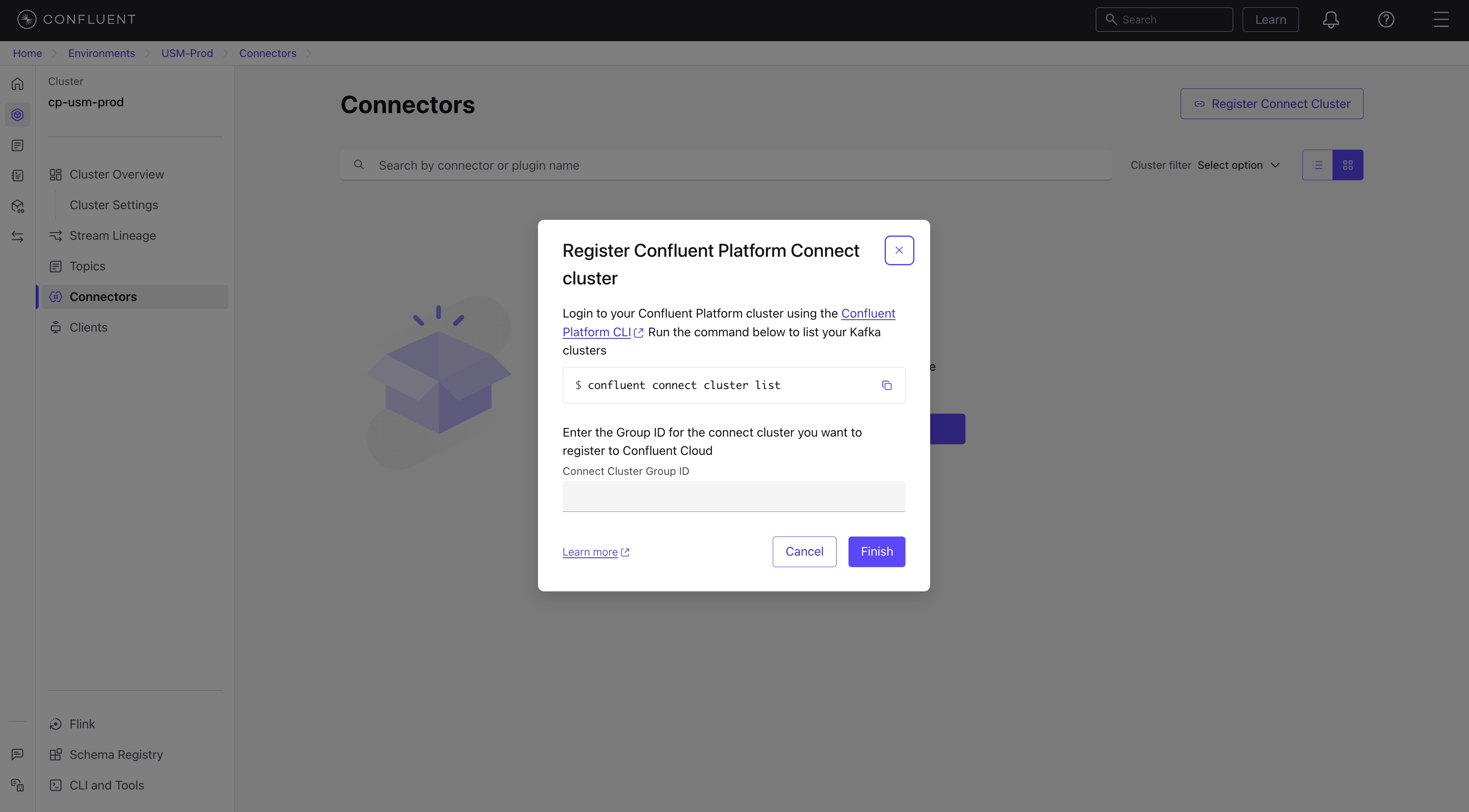 Enter the Confluent Platform Connect cluster ID in the Confluent Cloud Console.