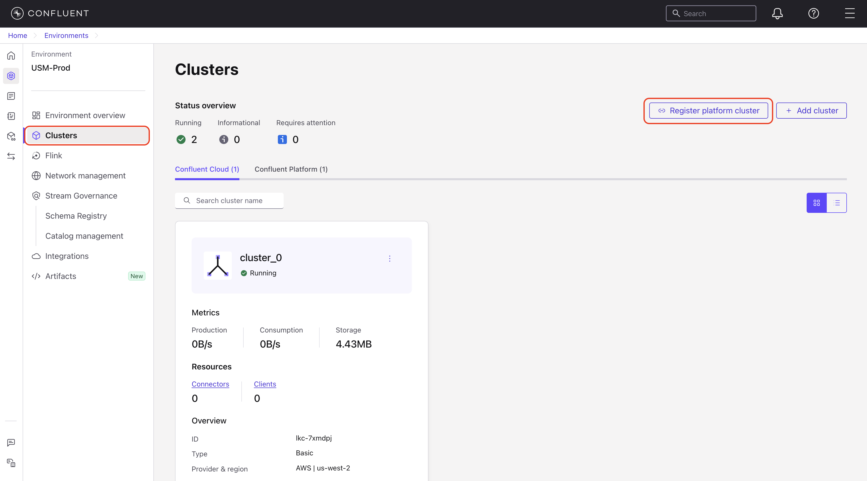 confluent cluster list.Ensure that your Confluent Cloud environment has the Advanced Governance package, which is required for USM. To upgrade your environment, see the upgrade instructions.