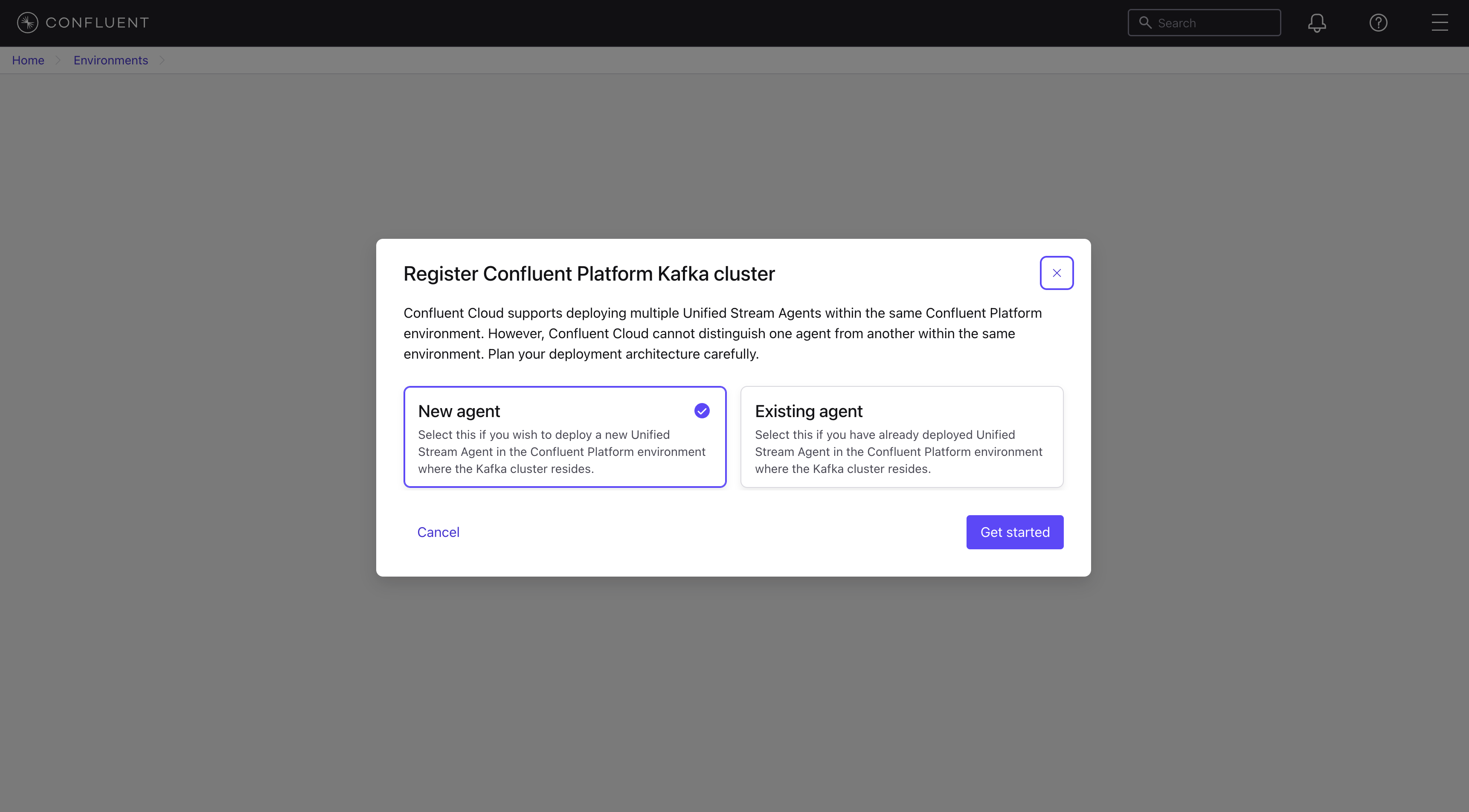 New agent: Deploy a new USM Agent in the Confluent Platform environment where the Kafka cluster resides to create a fresh agent deployment for the cluster.