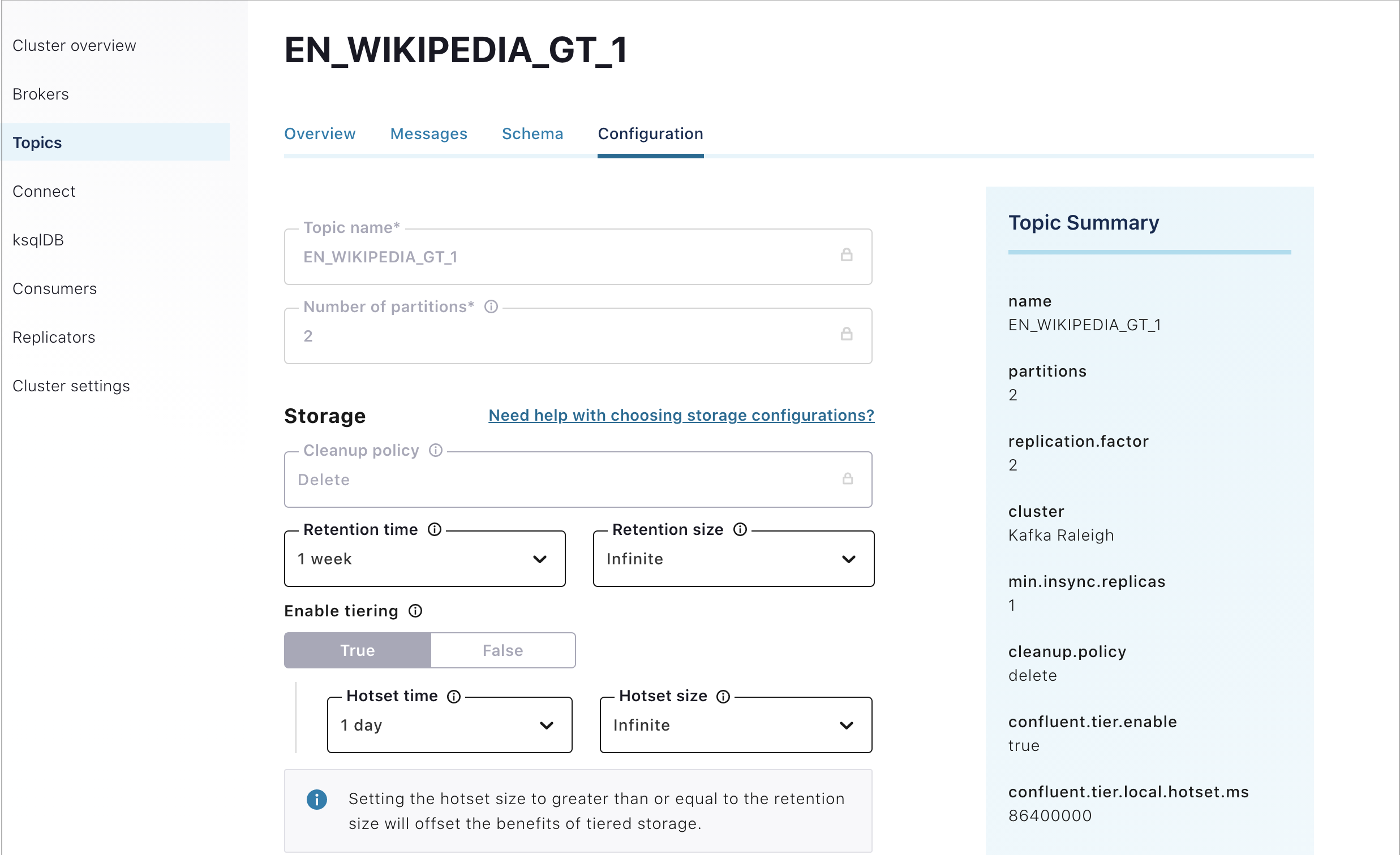 Click the Configuration tab. The Configuration page appears for the topic.