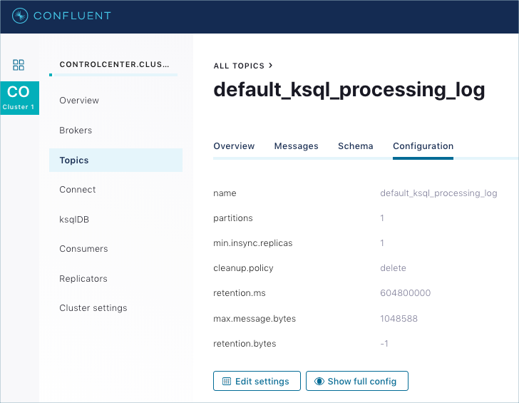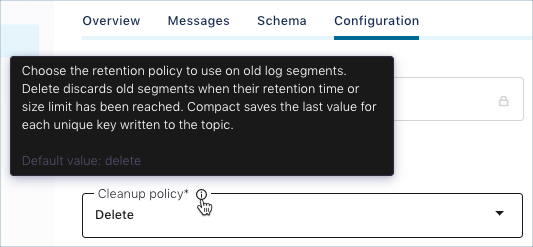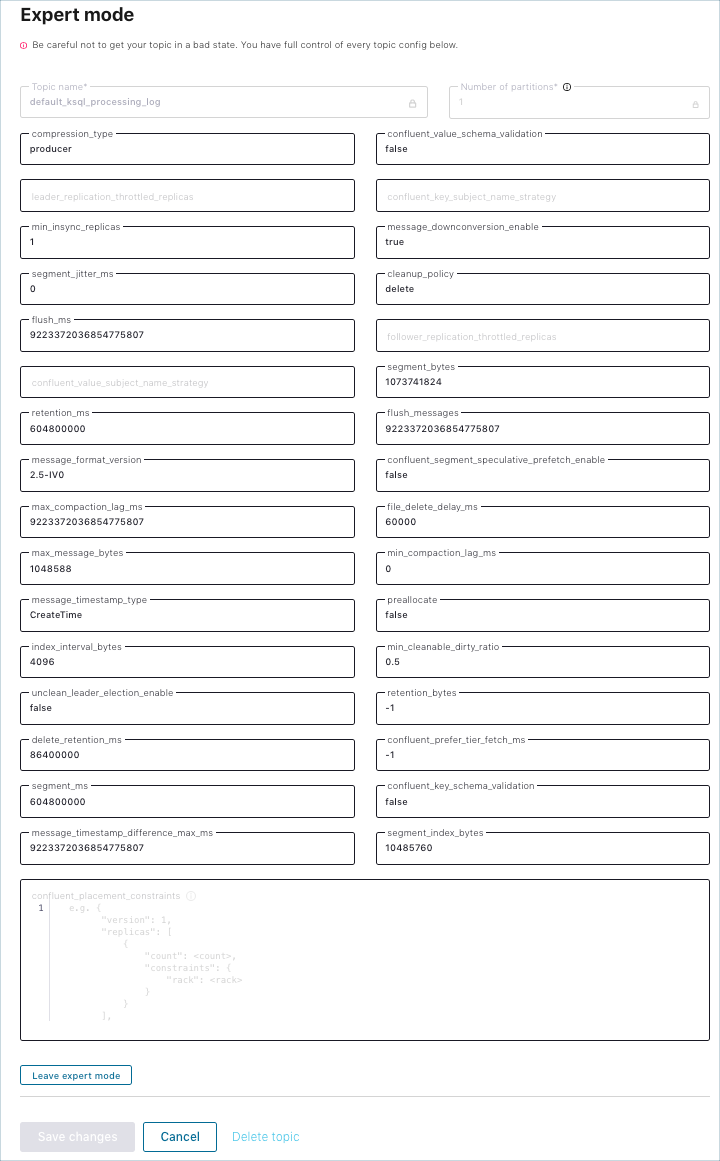 Be careful when setting configurations in expert mode. With expert mode, you have full control of every topic configuration and can potentially get your cluster into a bad state.