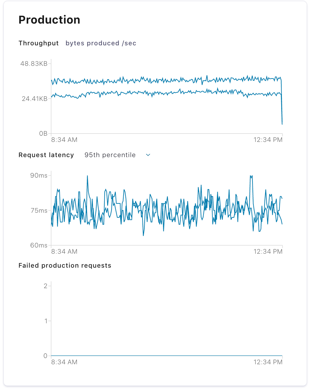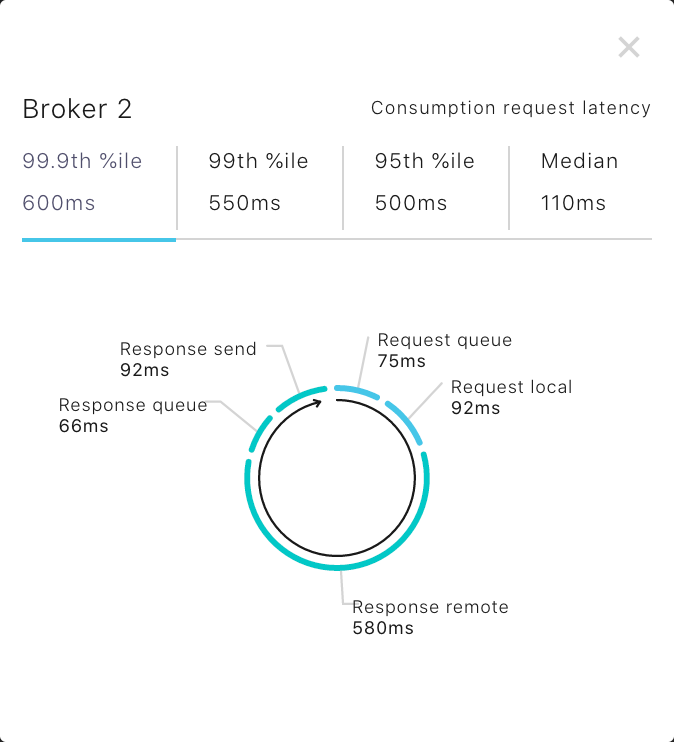 Click a point on the graph in the Request latency panels to view details on Production or Consumption request latency.
