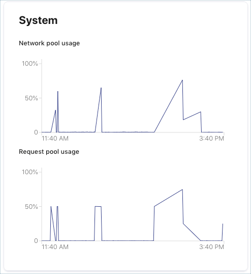 Network pool usage is the average network pool capacity usage across all brokers; that is, the percentage of time that the network processor threads are not idle.