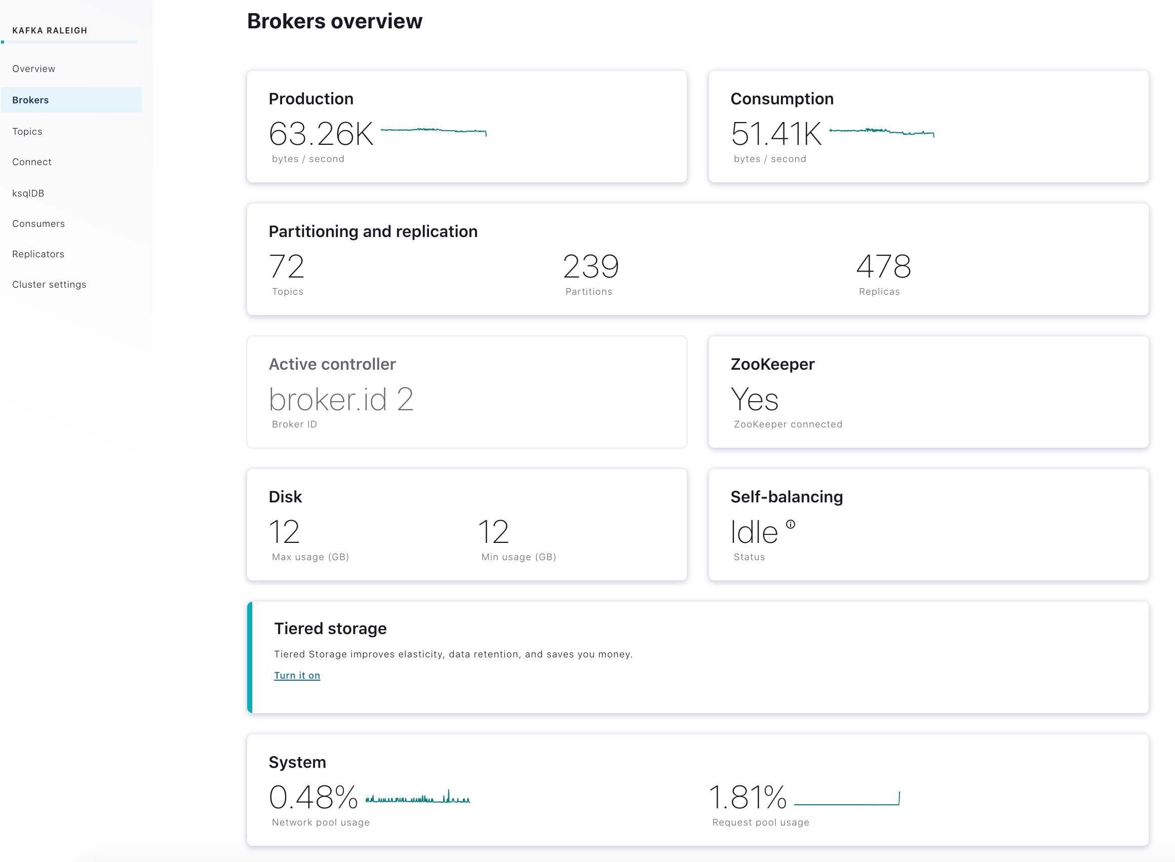 Starting with Confluent Platform 6.1, when the Self-Balancing Clusters feature is enabled, clicking the Self-balancing card displays broker task statuses.