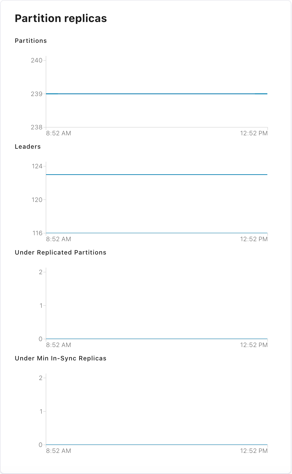 The charts show the total number of partitions, leaders, under-replicated partitions, and under min in-sync replicas.