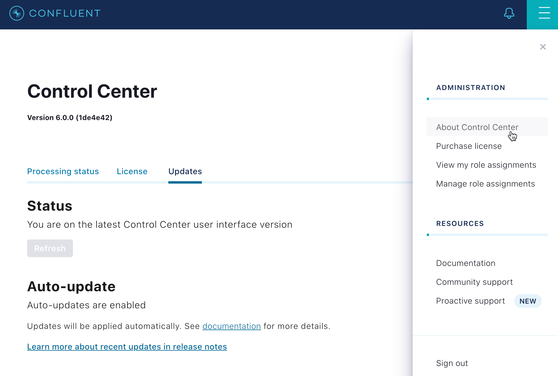 The Auto-update feature enables access to the most current version of the Control Center user interface (UI) within a minor release. The feature provides a more frequent cadence of releases for Control Center between patch releases. Updates can include security enhancements, minor features, and bug fixes. The feature does not update the UI between minor or major release versions, such as from 5.4 to 5.5; or from 5.4 to 6.0 respectively. The feature is available from Confluent Platform version 5.4 and later.
