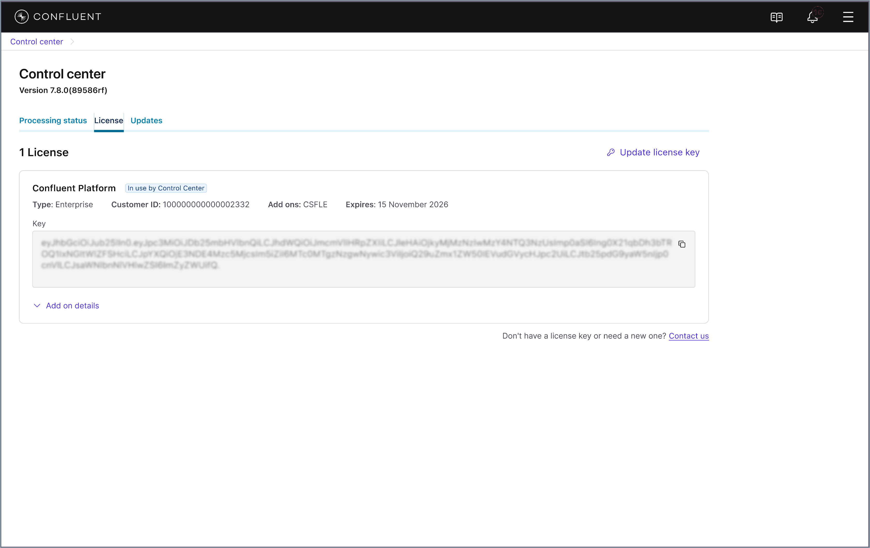 Besides using the License tab in the Control Center Administration UI, you can set the license key in the confluent.license property of the appropriate control-center.properties file on startup. Enter either the license key or a path to the license key file.