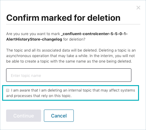 Deleting an internal topic could adversely impact your Confluent Platform installation. If in doubt, consult Confluent Support.