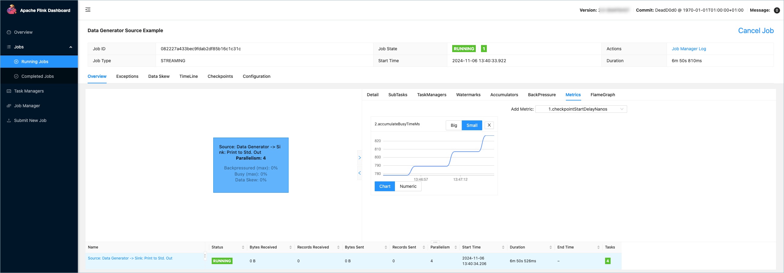 The following image shows an example of viewing metrics in the Flink WebUI.