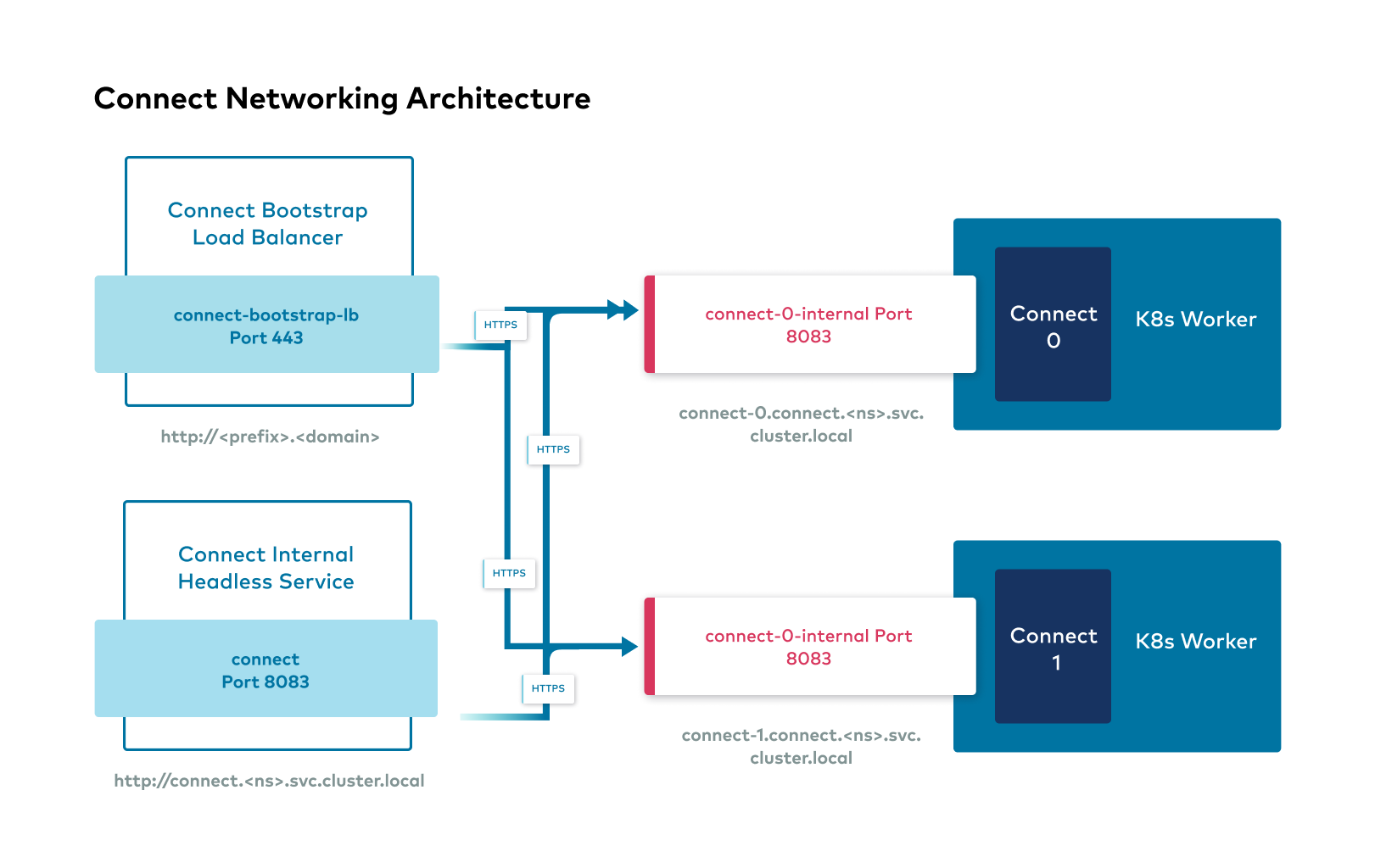 Clients connect to Confluent Platform at specified static ports (the NodePort) on the Kubernetes worker node (or via customer-managed networking infrastructure that can forward traffic to those ports).