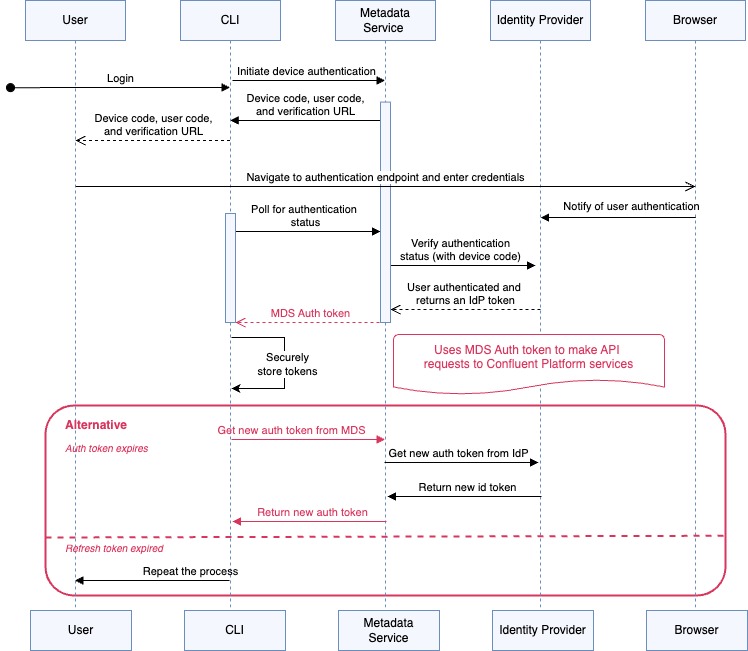 Once the end-user authentication succeeds with the IdP, MDS issues a token to the CLI. This MDS token is built on top of the IdP issued token and contains the identity information of the end user. For further authentication requests with other Confluent Platform services the CLI continues to use the MDS token instead of the IdP issued token.