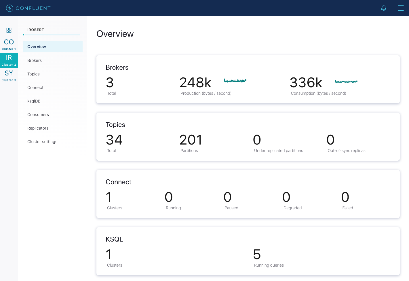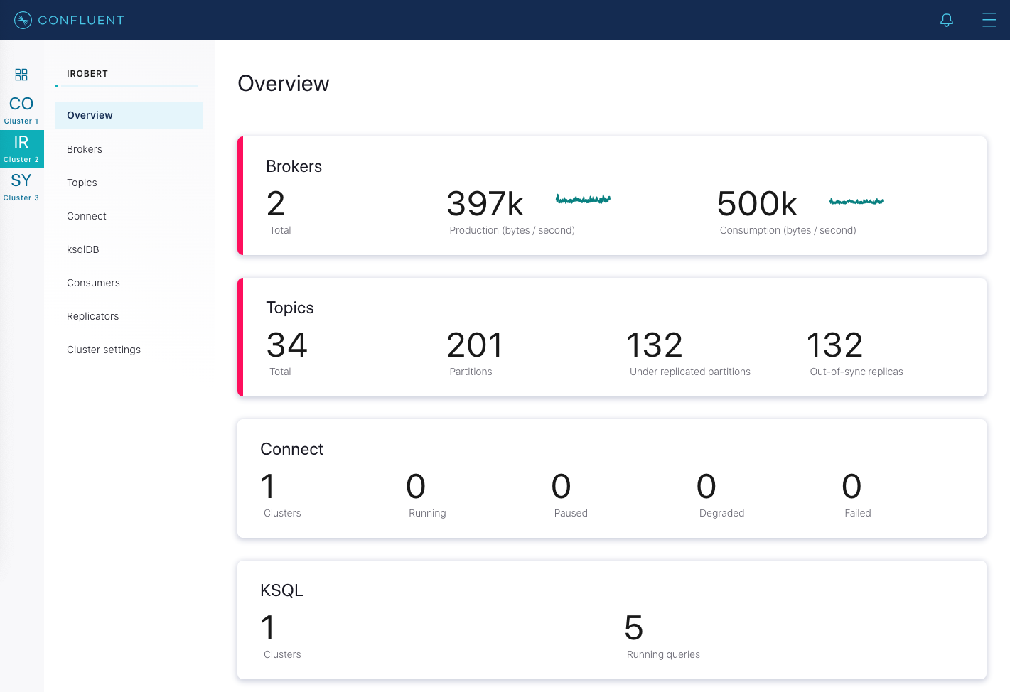 4. Wait until that broker completely restarts and is caught up before proceeding to restart the next broker in your cluster. Waiting is important to ensure that leader failover happens as cleanly as possible. To know when the broker is caught up, in Control Center, navigate to Overview of the cluster, and observe the Under replicated partitions value. During broker restart, this number increases because data will not be replicated to topic partitions that reside on the restarting broker.
