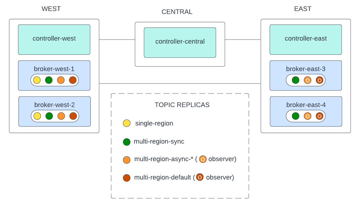 To try a detailed Multi-Region Clusters example, run the end-to-end Tutorial: Multi-Region Clusters on Confluent Platform. The tutorial injects latency and packet loss to simulate the distances between the regions and showcases the value of the new capabilities in a multi-region environment.
