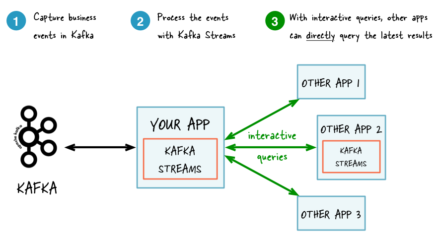 The following diagram juxtapose two architectures: the first does not use Interactive Queries whereas the second architecture does. It depends on the concrete use case to determine which of these architectures is a better fit – the important takeaway is that Kafka Streams and Interactive Queries give you the flexibility to pick and to compose the right one, rather than limiting you to just a single way.