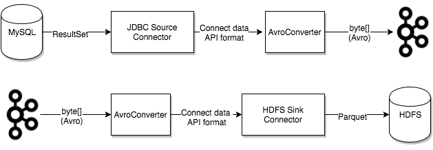 Converters are decoupled from connectors themselves to allow for the reuse of converters between connectors. For example, using the same Avro converter, the JDBC Source Connector can write Avro data to Kafka, and the HDFS Sink Connector can read Avro data from Kafka. This means the same converter can be used even though, for example, the JDBC source returns a ResultSet that is eventually written to HDFS as a parquet file.