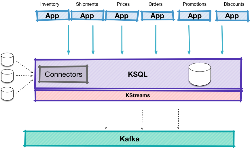 Illustration of the ksqlDB architecture showing embedded Kafka connectors