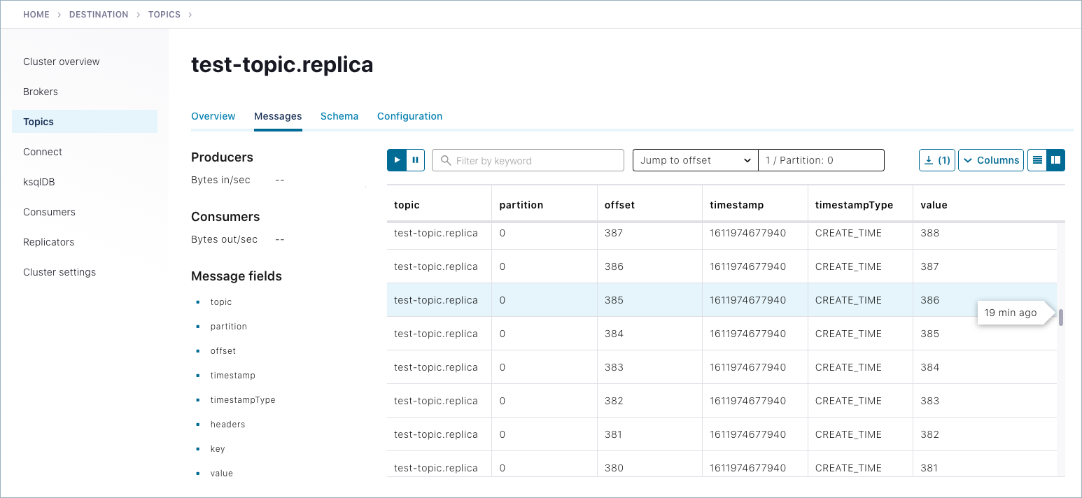 test-topicon the origin cluster to view messages on the original topic, and totest-topic.replicaon the destination to view messages on the replicated topic.