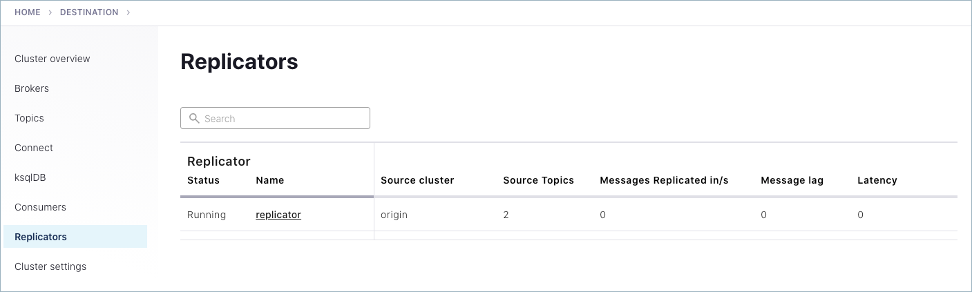 On Control Center, select the destination cluster, click Replicators on the navigation panel, and use Control Center to monitor replication performance and drill down on source and replicated topics.