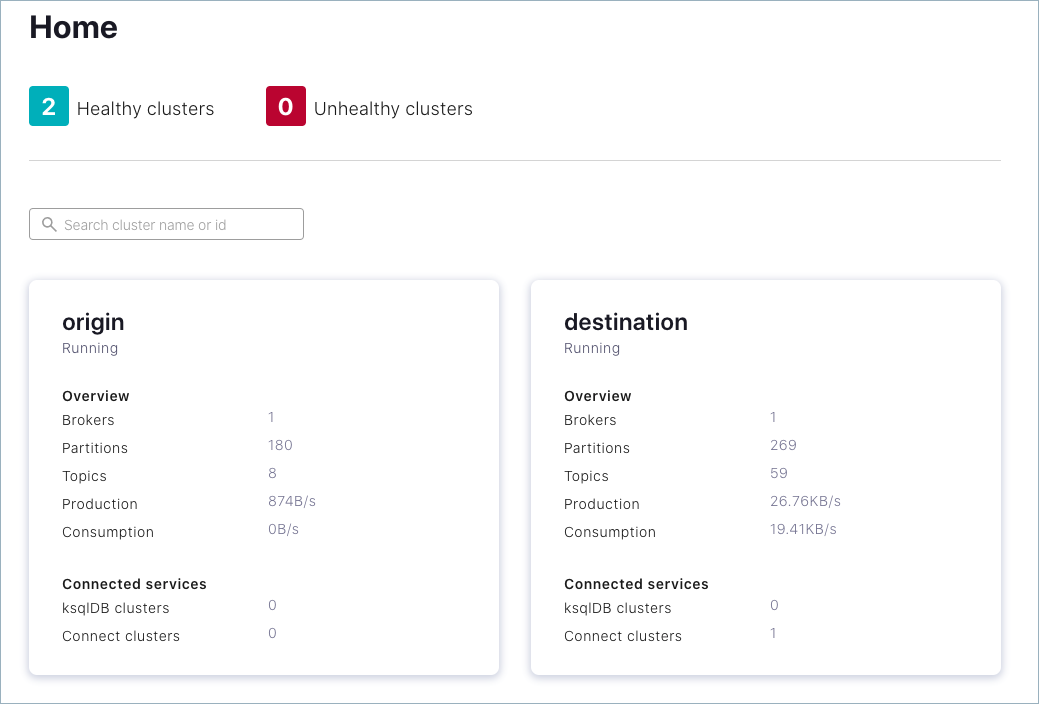 my-examples/server_destination.propertiesandmy-examples/server_origin.propertiesmust have the same configuration forconfluent.metrics.reporter.bootstrap.servers=localhost:9092.When adapting these steps to more complex, real-world environments, you may decide to use a different approach. For example, in a deployment with multiple instances of Control Center for source and destination, each monitoring its own respective cluster,