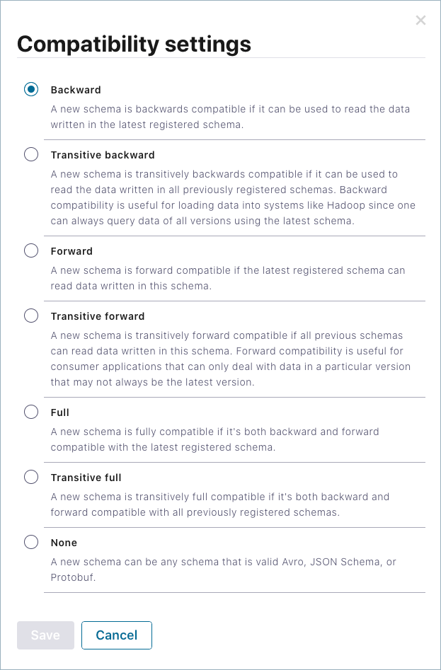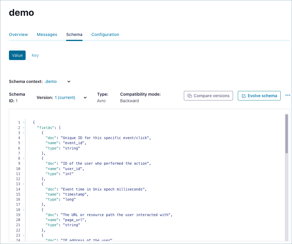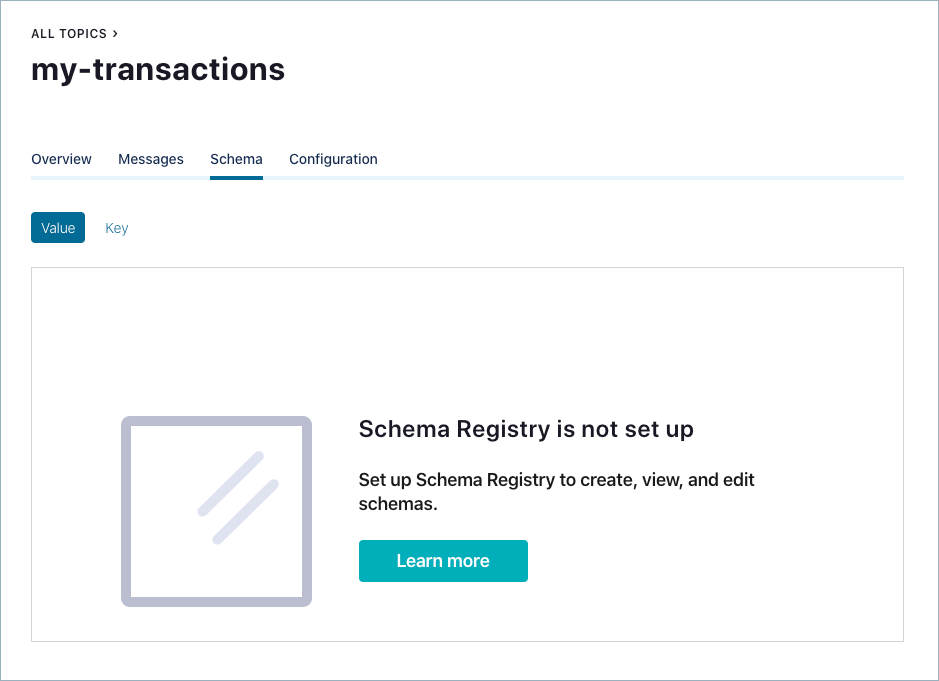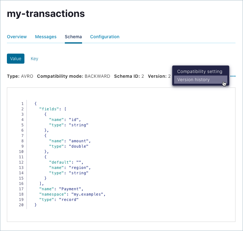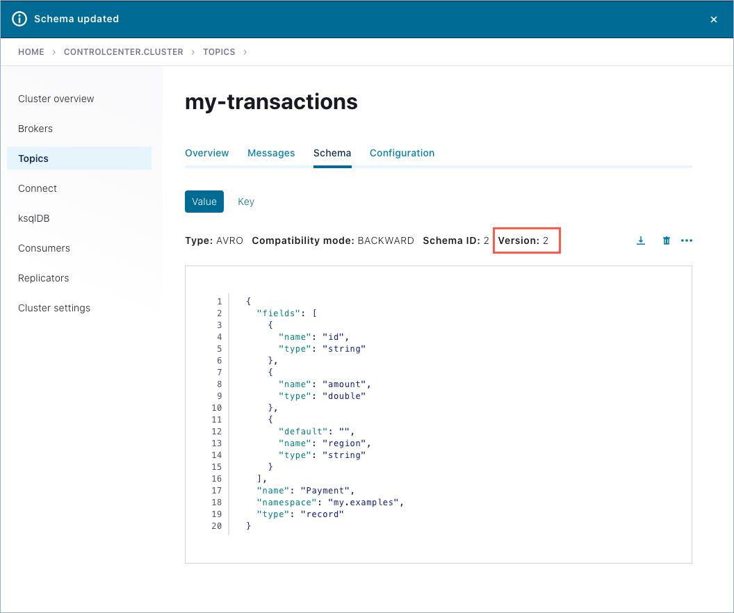 http://localhost:9021/by default, as described in Install and access.)Select a cluster from the navigation bar, click the Topics menu, and explore the schema management options for one or both clusters.