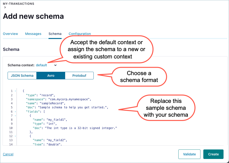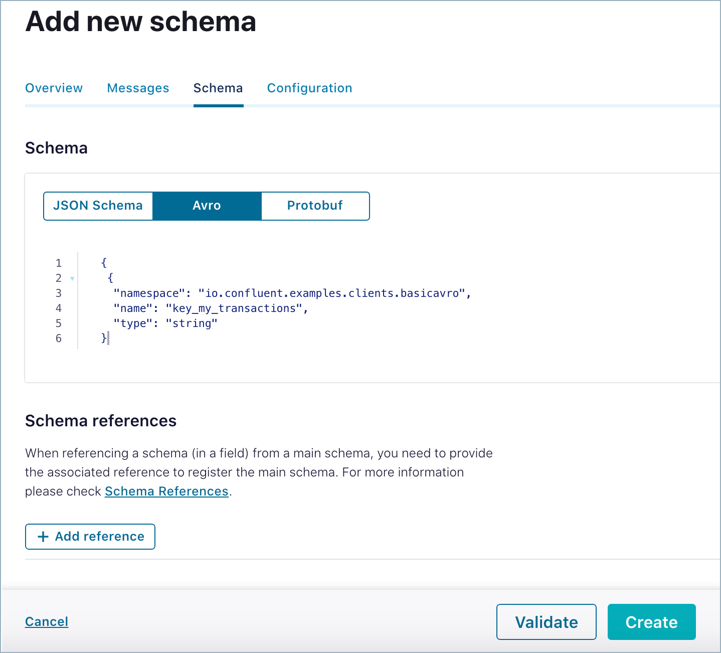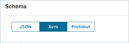 Add the schema with the appropriate schema format selected. This example shows an Avro schema.
