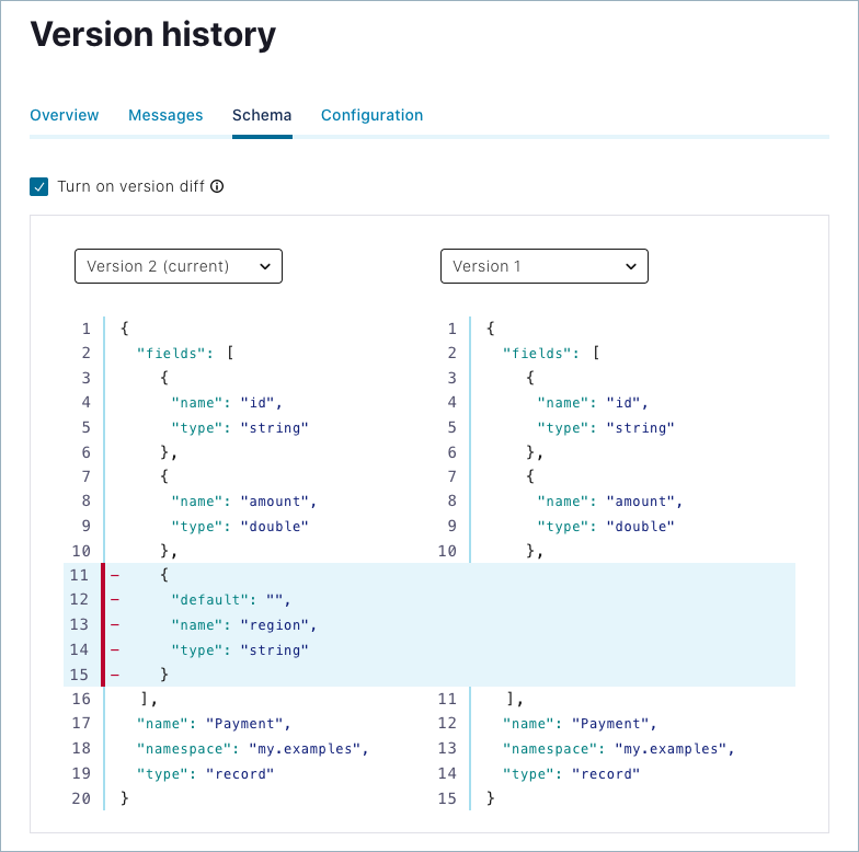 name: Enter a name for the schema if you do not want to accept the default, which is determined by the subject name strategy. The default isschema_type_topic_name. Required.type: Eitherrecord,enum,union,array,map, orfixed. (The typerecordis specified at the schema’s top level and can include multiple fields of different data types.) Required.namespace: Fully-qualified name to prevent schema naming conflicts. String that qualifies the schemaname. Optional but recommended.fields: JSON array listing one or more fields for a record. Required.Each field can have the following attributes: