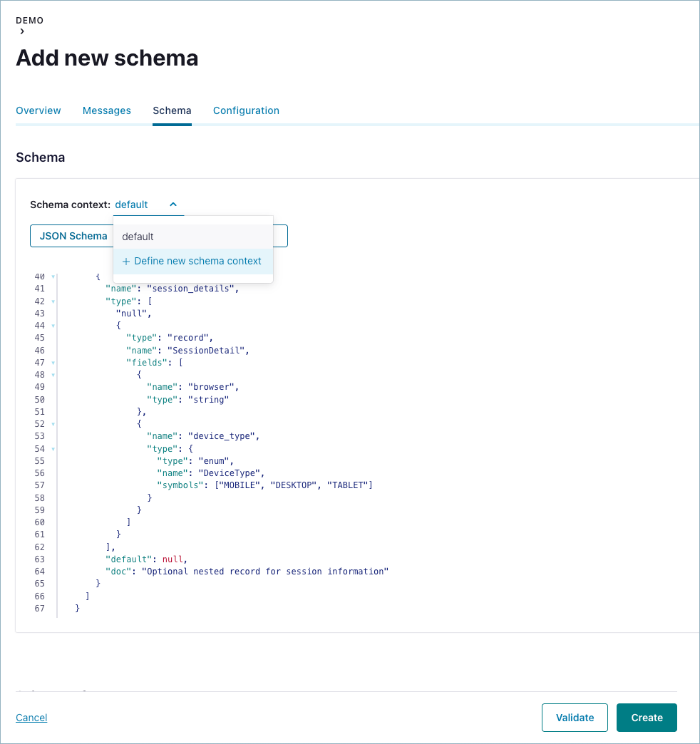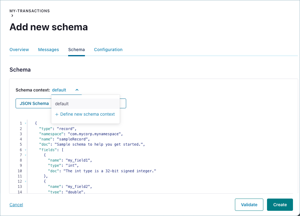You can either accept the default context or specify a custom context when you create a schema in Control Center. To create a new context under which to create a schema: