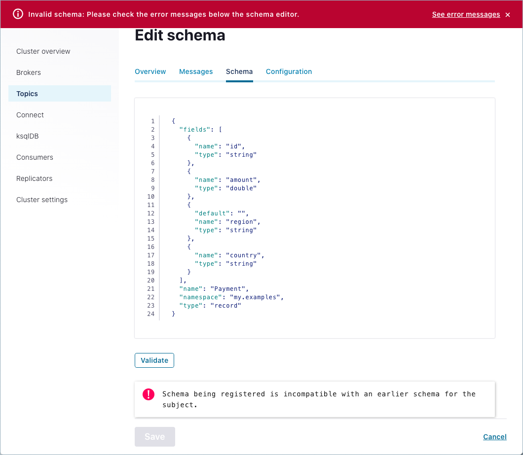 If the entered schema is not valid, an Input schema is an invalid Avro schema error is displayed in the banner area.