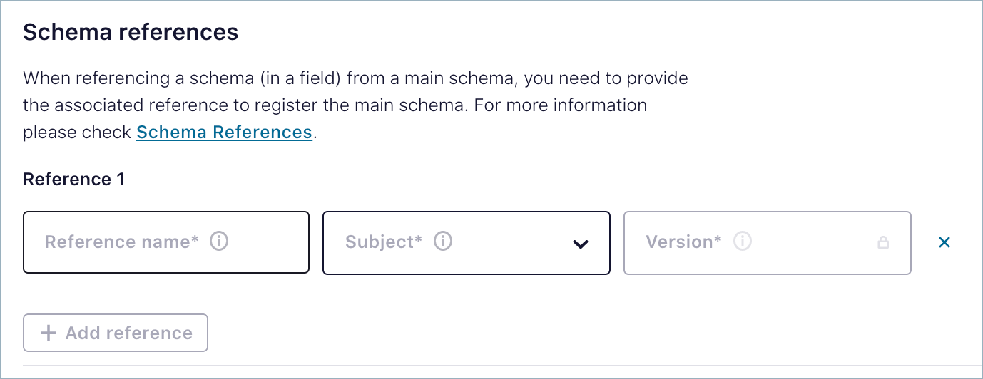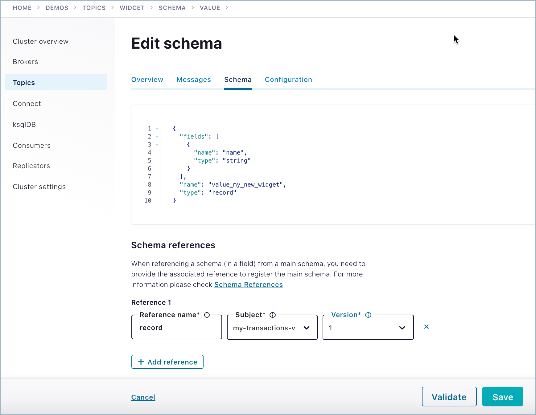 For example, to reference the schema for the my-transactions topic (my-transactions-value) from the widget schema, you can configure a reference to type, record as shown.