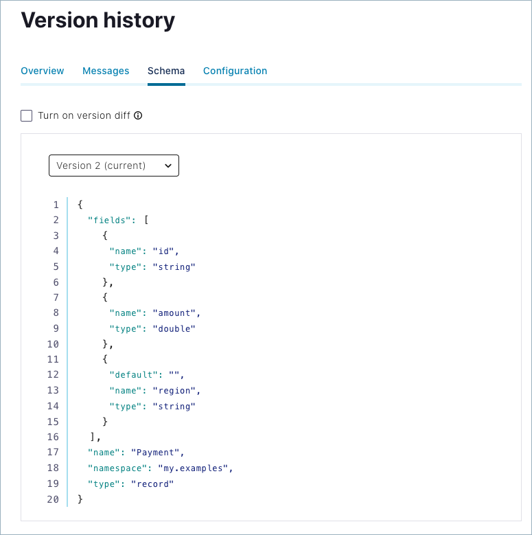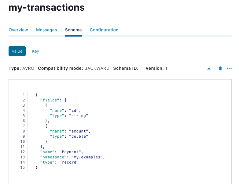 { "type": "record", "namespace": "my.examples", "name": "Payment", "fields": [ { "name": "id", "type": "string" }, { "name": "amount", "type": "double" } ] }